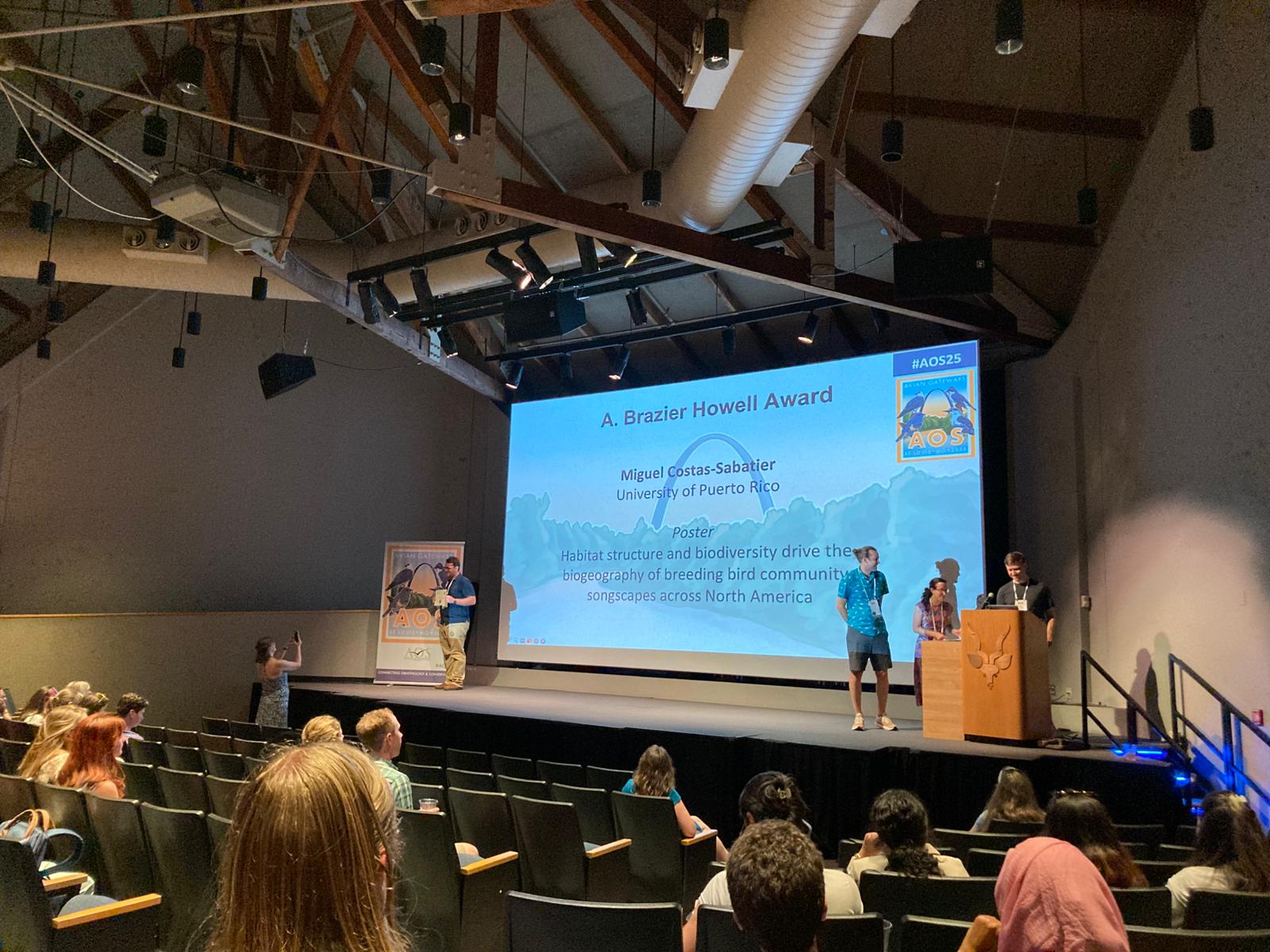 Ph.D. student Miguel José Costas-Sabatier recently attended the 143rd Annual meeting of the American Ornithological Society in St. Louis, MO and received the A. Brazier Howell Award for the best student presentation in any topic in ornithology. The poster entitled “Habitat structure and biodiversity drive the biogeography of community songscape across North America” used large datasets and computational power to reveal the importance of habitat structure in determining the “distribution” of songs throughout the United States. This recognition came with a $500 prize.